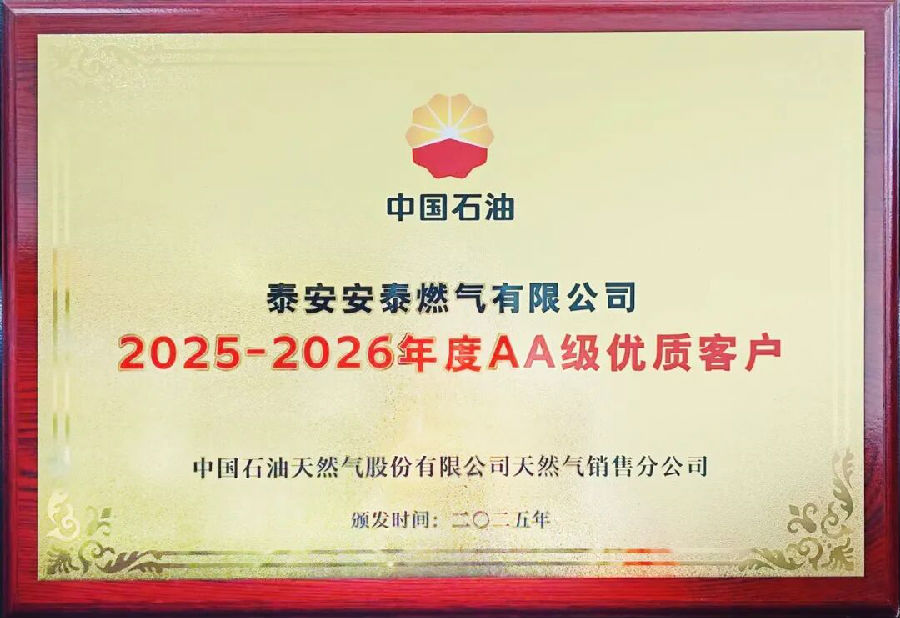 近日,泰安安泰燃?xì)庥邢薰颈恢袊吞烊粴夤煞萦邢薰咎烊粴怃N售分公司授予“2025—2026年度AA級優(yōu)質(zhì)客戶”榮譽(yù)稱號。該榮譽(yù)是中國石油對合作企業(yè)的高度認(rèn)可,更是對公司長期以來深耕能源保障、恪守契約精神、積極履行社會責(zé)任的權(quán)威肯定。