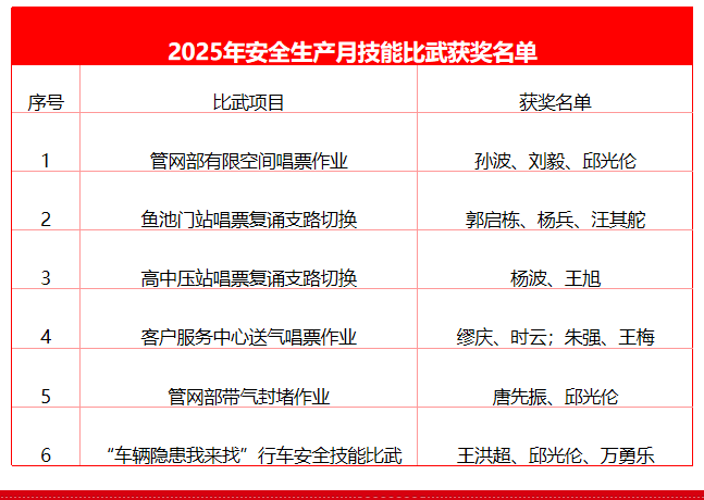 公司圍繞行車安全與燃?xì)馍a(chǎn)運(yùn)營,開展多樣化比武活動。生產(chǎn)運(yùn)營方面,管網(wǎng)部、魚池門站、高中壓站及客戶服務(wù)中心分別開展了閥門井有限空間作業(yè)、支路切換、送氣安全操作唱票、封堵作業(yè)等比武活動,以實(shí)戰(zhàn)化強(qiáng)化“唱票復(fù)誦”機(jī)制,切實(shí)提升一線人員規(guī)范操作水平。后勤保障方面,通過舉辦“車輛隱患我來找”行車安全技能比武,將安全規(guī)范融入操作細(xì)節(jié),讓應(yīng)急能力在競技中淬煉升華。